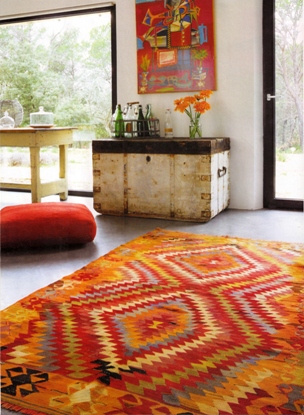 Vagy dönthetünk egy modernebb, egyszerűbb mintázatú kilim mellett, ami belesimul ugyan a környezetébe, de a kézzel font gyapjúval, a természetes színek teltségével és a hagyományos kézi szövés esetlegességével oldja a tér feszességét.